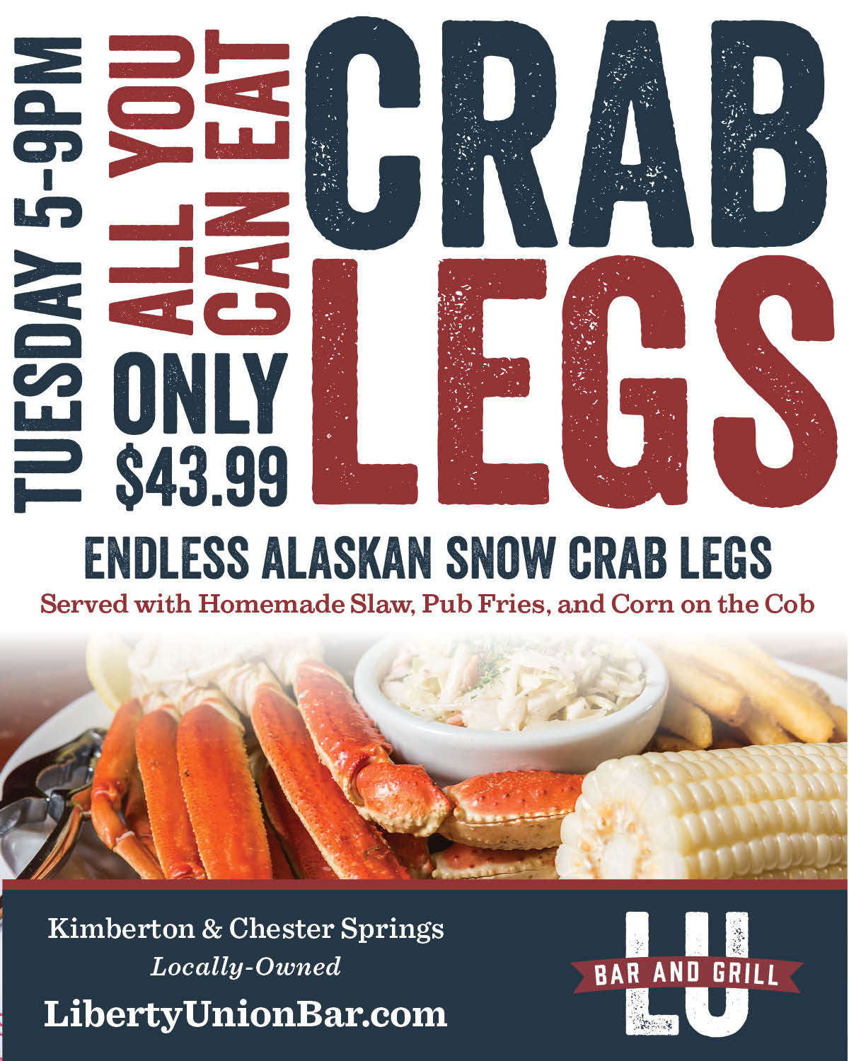 All-You-Can-Eat Snow Crab Legs. Enjoy steamed snow crabs with melted butter, Fries, coleslaw, corn on cob. Still hungry??? Just order more... Available at both locations from 5-9pm. Kimberton: 484-927-4244 Chester Springs: 484-359-4061