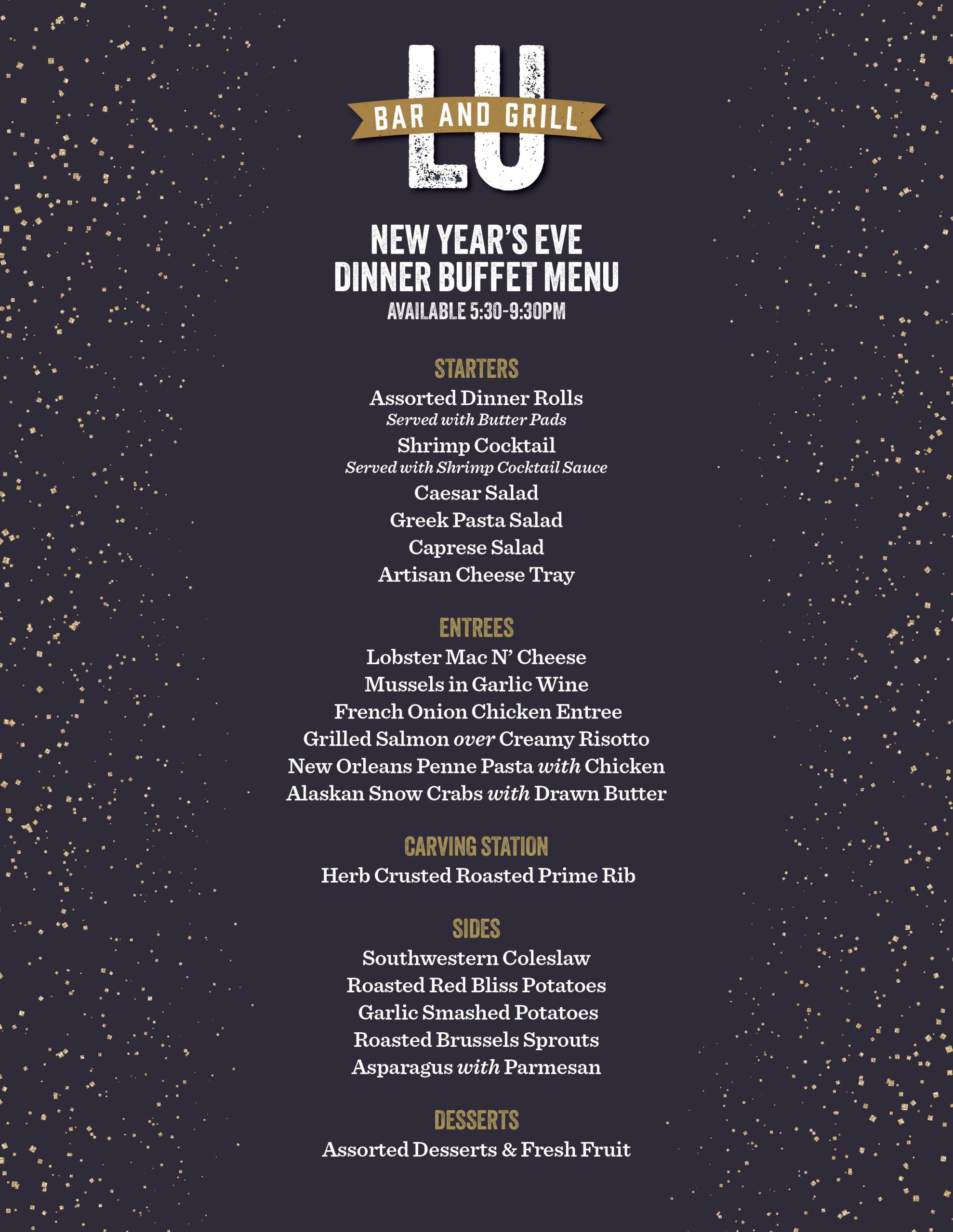 Ring in the New Year with our NYE Grand Buffet. Served from 5:30-9:30pm. Stay for our Live Music and FREE Champagne Toast at Midnight