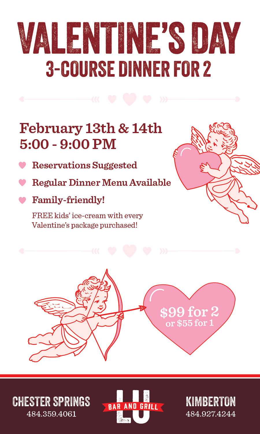 Valentine’s weekend, bring your sweetheart out for a fabulous 3 course dinner. Only$99 per couple, $55 for single. Make your reservations today!