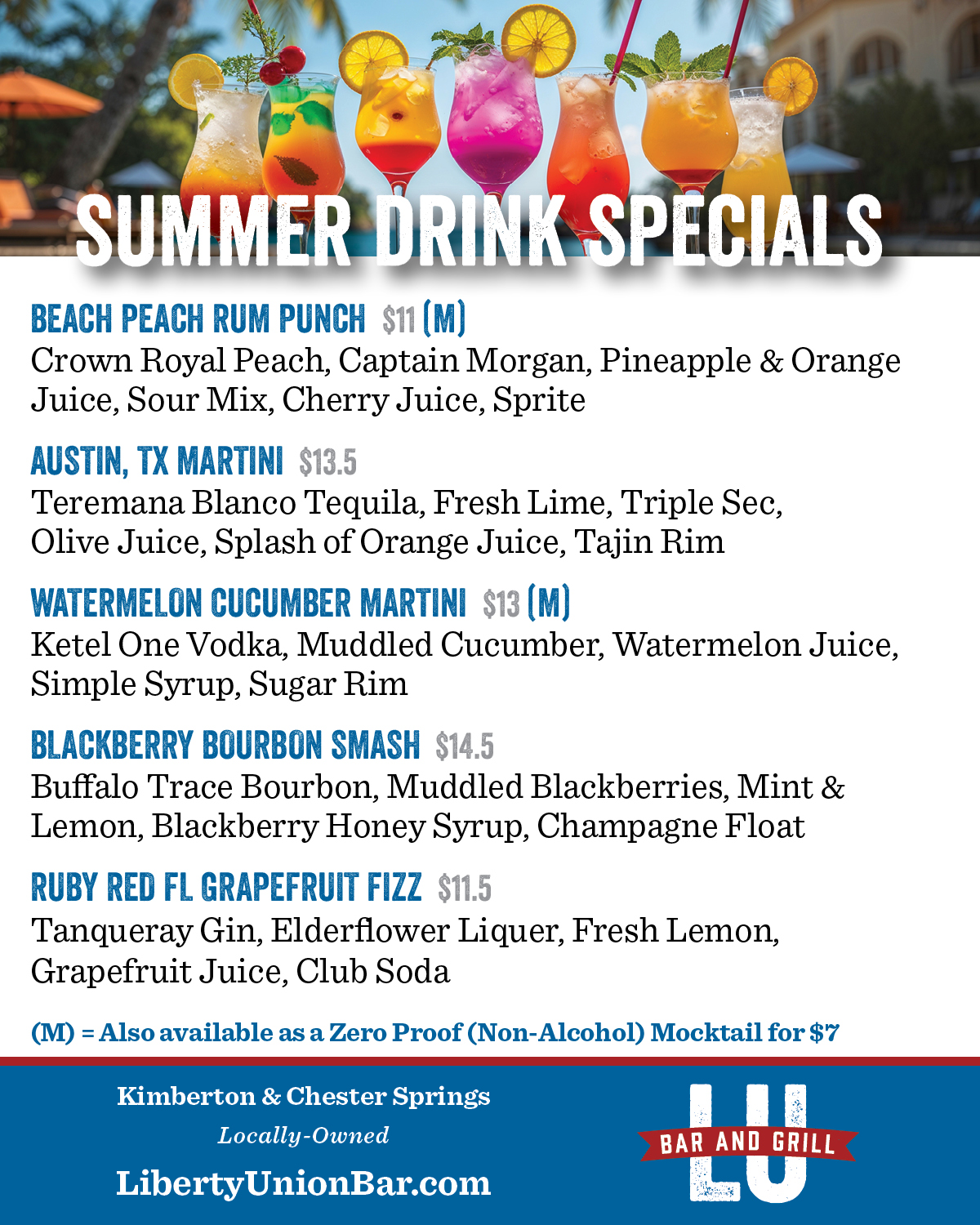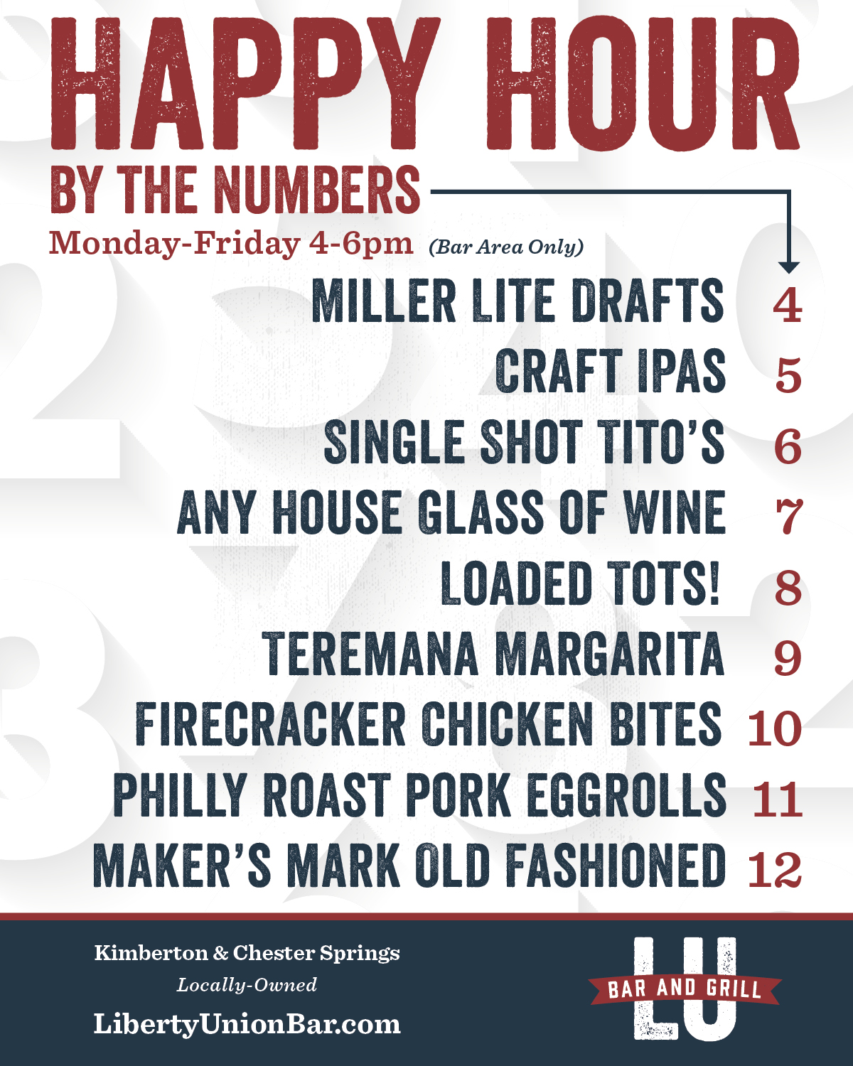 Miller Lite Draft 4 Craft IPA's 5 Single Shot Tito's 6 House Wine Glass 7 Loaded Tots 8 Teremana Margaritas 9 Firecracker Chicken 10 Philly Pork Eggrolls 11 Maker's Mark Old Fashioned 12
