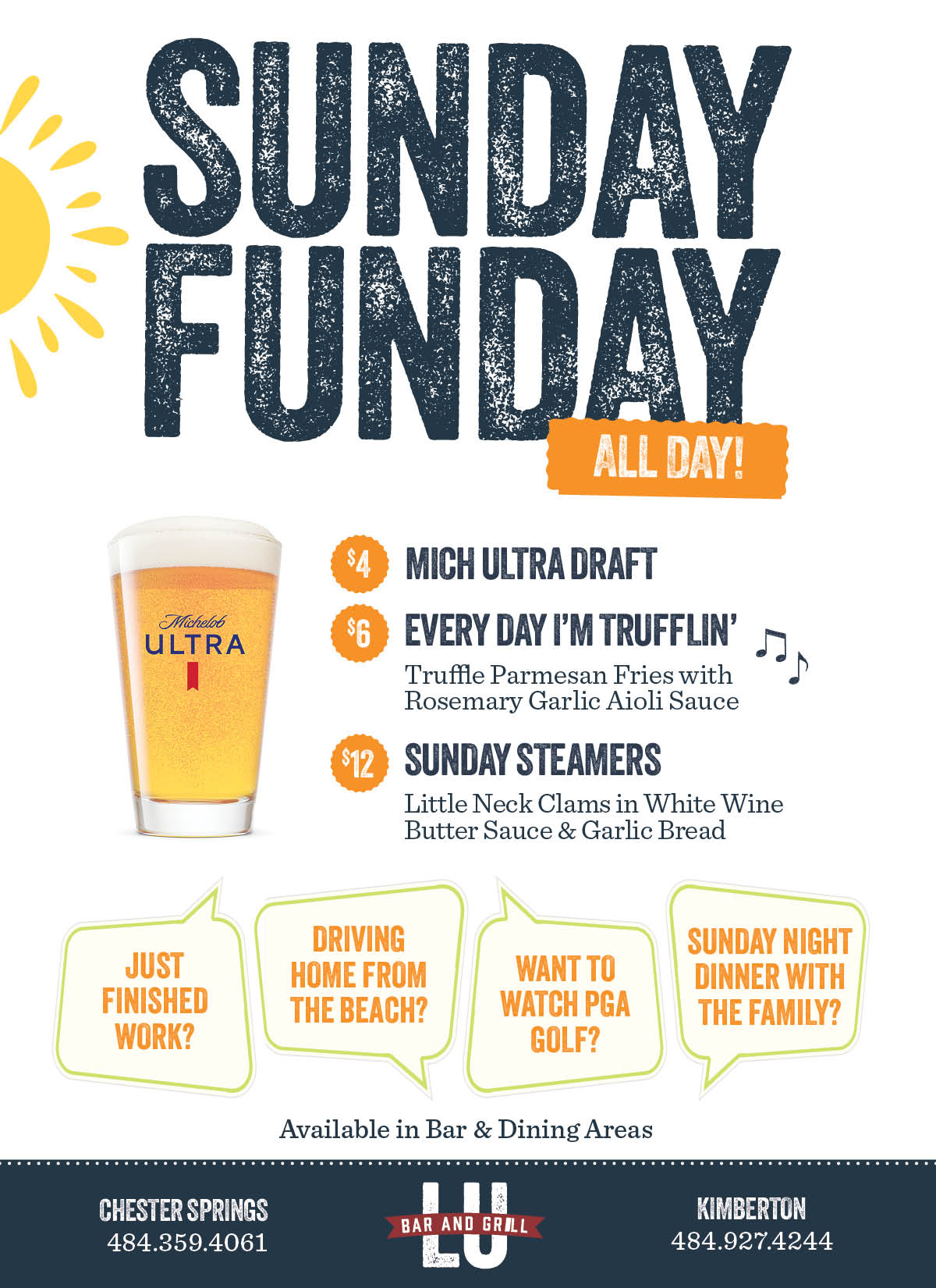Summer fun is starting early this year! Mich Ultra Drafts only $4 All Day Every Sunday!! $6 Parmesan Truffle Fries & $12 Sunday Steamed Clams with Garlic Bread All Day - Sundays Only!!!